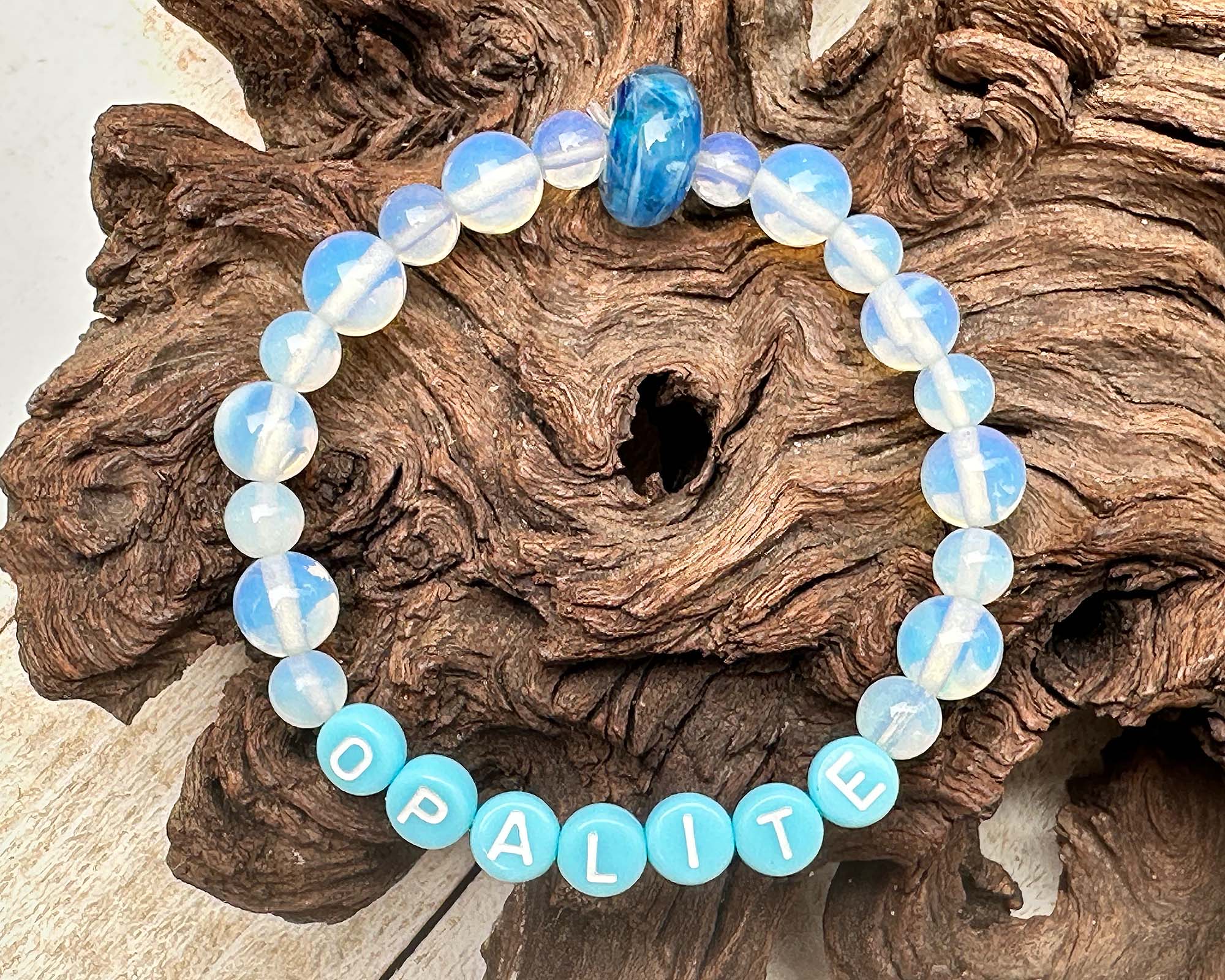 Discover the elegance of this beautifully crafted bracelet, featuring striking beads inspired by opalite gemstone and accented by handcrafted lampwork beads in iridescent shades of blue. Each piece is carefully handmade, showcasing intricate craftsmanship and artistic detail that makes it truly one-of-a-kind. Designed with a gentle stretch, it offers a comfortable fit for smaller wrists (6½–7 inches), making it a effortlessly chic accessory for any occasion.