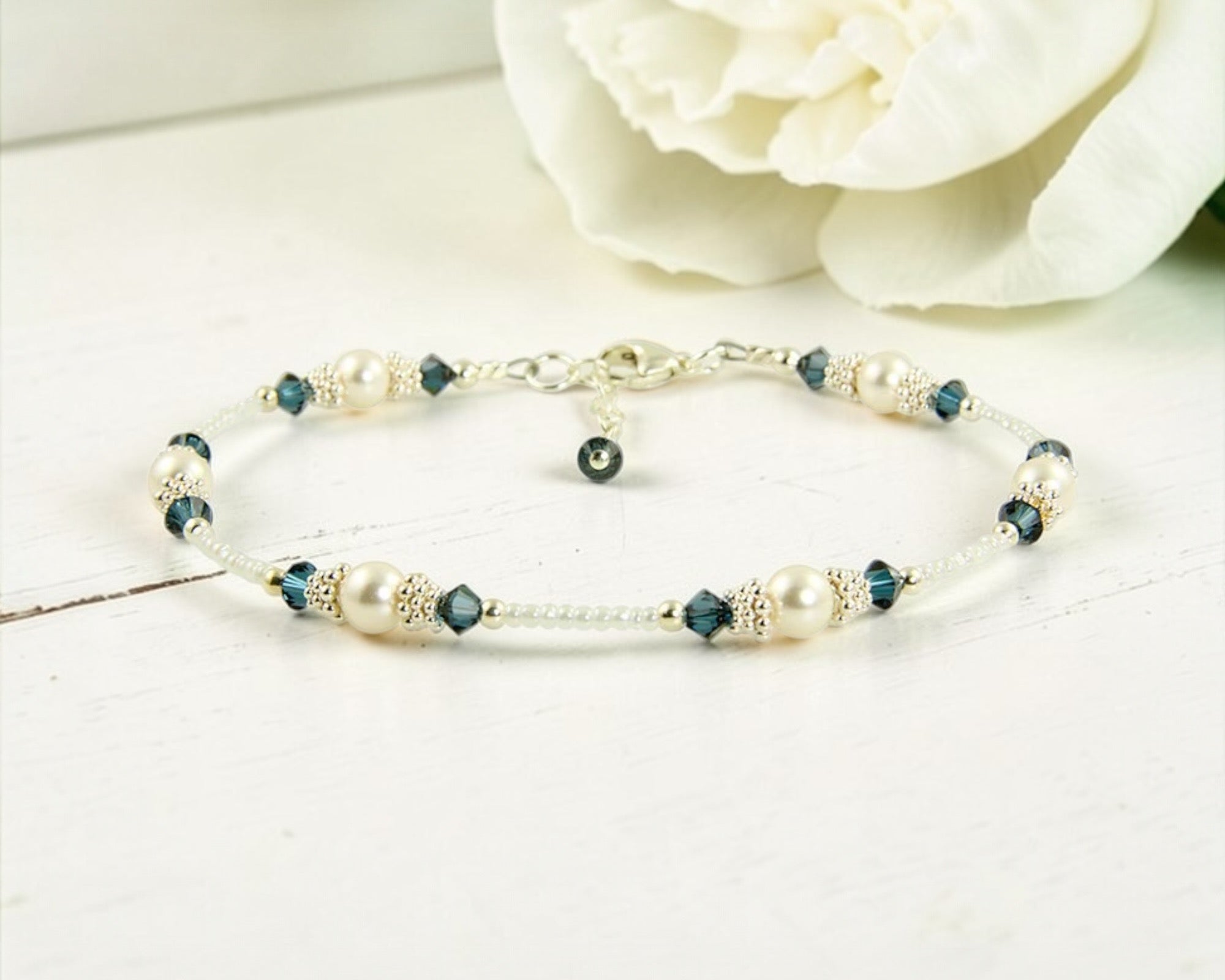 This delicate, handcrafted anklet features glistening cream Charlotte seed beads, paired with deep, dark sapphire Swarovski Austrian crystals for a more dramatic, refined blue tone. Perfectly round Swarovski crystal-based pearls in your choice of white or cream add a soft, classic glow, while bright Bali .925 silver accents and sterling silver components complete the design with a polished finish.
