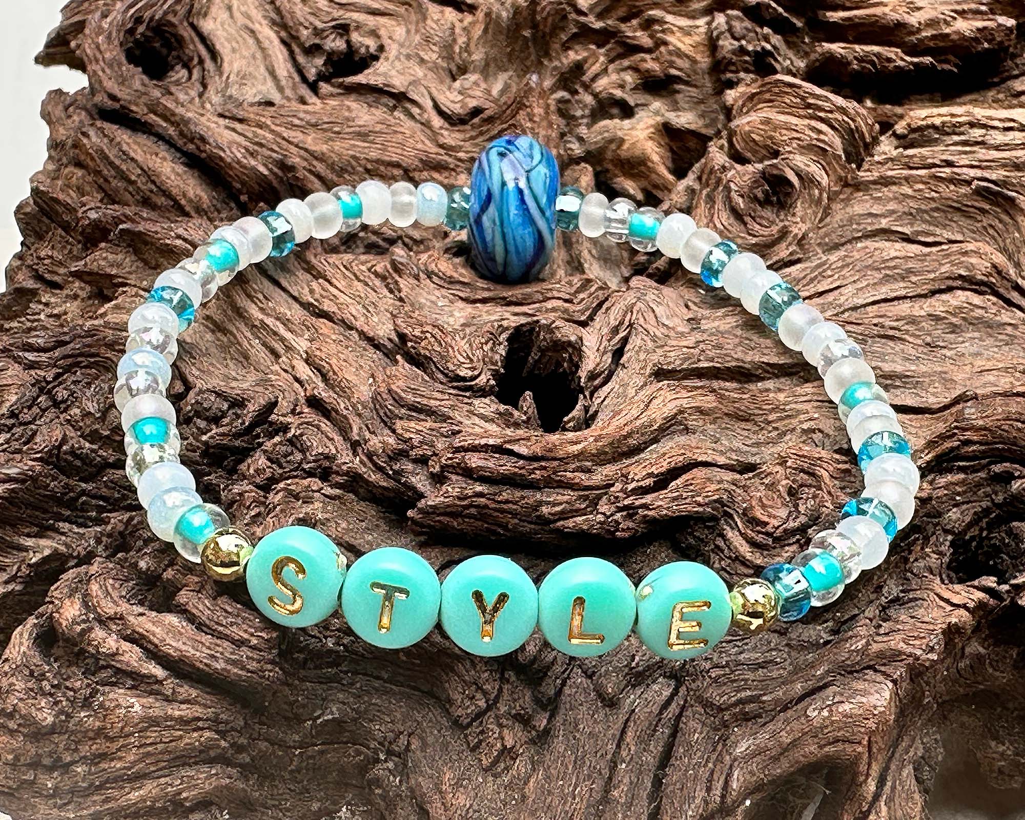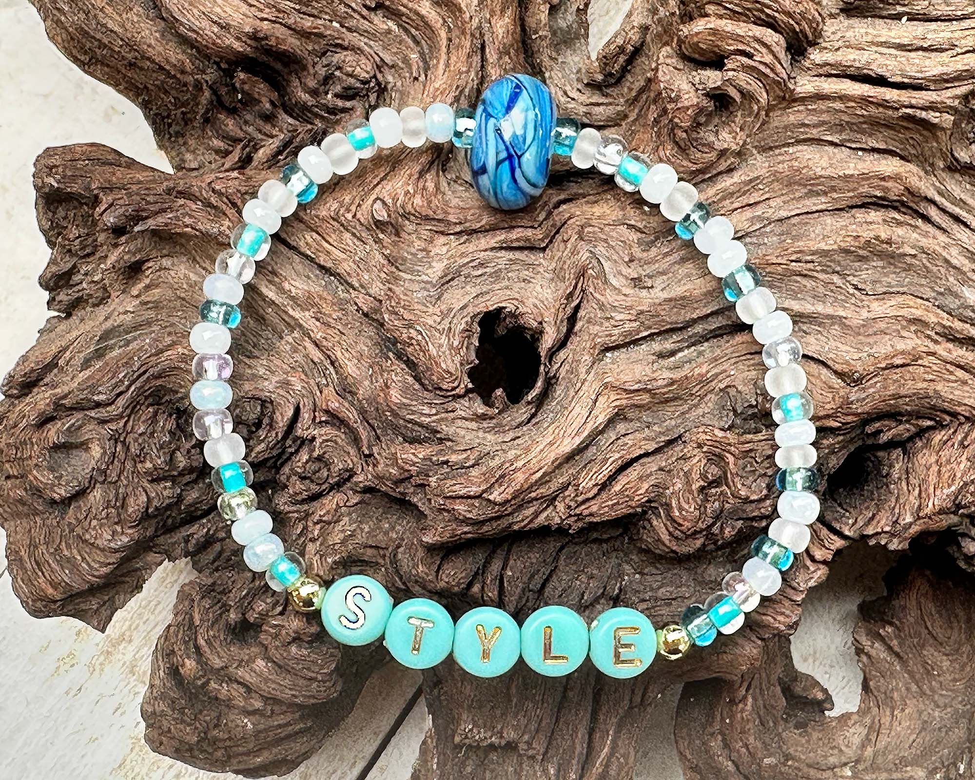 Discover the elegance of the "Style" Bracelet, a beautifully crafted piece soft blue, teal greens, and opal white accented by a handcrafted lampwork bead. Each bracelet is carefully handmade, showcasing intricate craftsmanship and artistic detail that makes it truly one-of-a-kind. Designed with a gentle stretch, it offers a comfortable fit for smaller wrists (6 inches), making it a effortlessly chic accessory for any occasion.